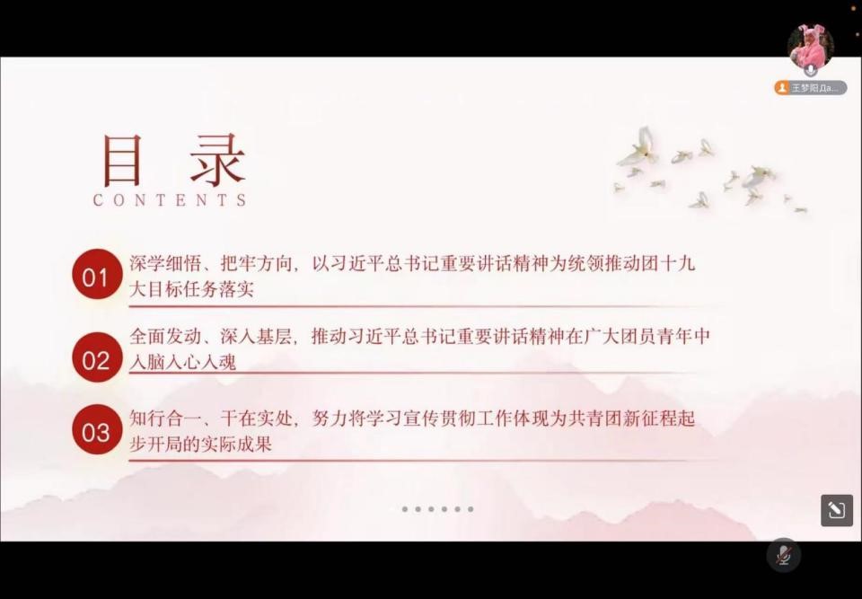 活动分为三个部分学习,第一部分为“深学细悟、把牢方向,以习近平总书记重要讲话精神为统领推动团的十九大目标任务落实”,第二部分为“全面发动、深入基层,推动习近平总书记重要讲话精神在广大团员青年中入脑入心入魂”,第三部分为“知行合一、干在实处,努力将学习宣传贯彻工作体现为共青团新征程起步开局的实际成果”,在学习中团学干部不断增强做好新时代共青团工作的责任感使命感。