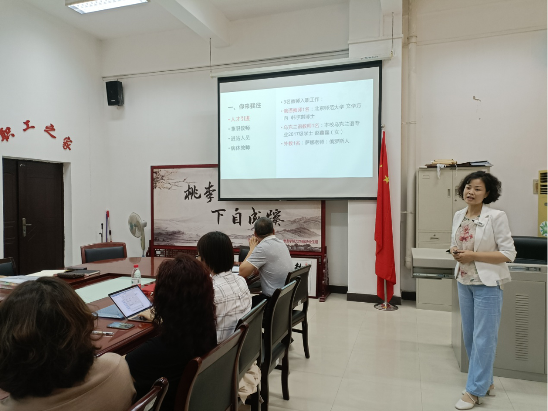 马晓迪副院长就本科教学相关工作做出了总结和部署。她首先回顾了2021年俄语专业四八级考试安排和成绩情况,总结了暑假期间教学管理工作的推进效果,重点介绍了2021年本科培养方案微调工作进展、中译外实验班建设情况,以及全国俄语大赛及永旺杯口译大赛相关安排,并宣读了学校有关新学期本科教学工作的相关要点。