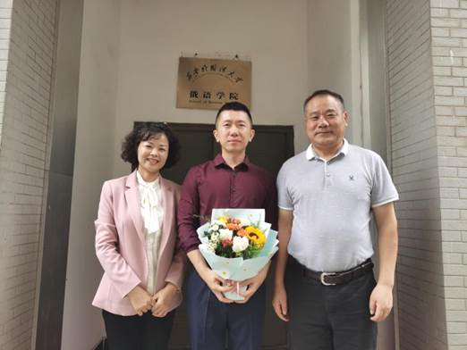 魏民安书记(右一)和徐莉副院长(主持工作)(左一)为谢昆老师(中)送上鲜花