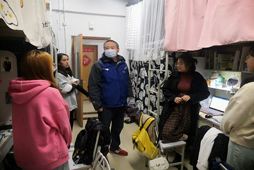 在本科生宿舍走访过程中,魏书记一行亲切地与学生交谈,暖心嘱咐学生们寒潮来临,要注意保暖防寒。同时,提醒全体学生在进出校园时,主动配合扫码测温并佩戴好口罩,建议大家尽量减少外出,不去人员密集场所。