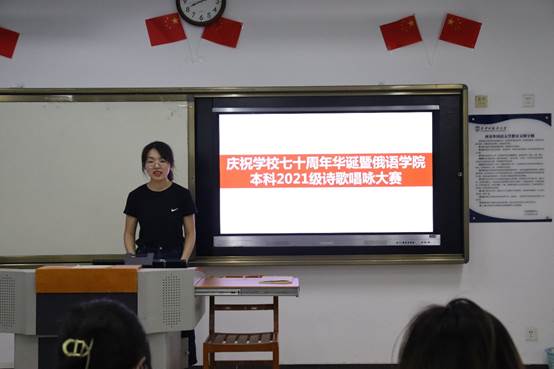 在JB112举行本科2021级俄语诗歌唱咏大赛。俄语低年级教研室主任范会芝、外教ОльгаВладимировнаДубкова在现场为参赛选手进行点评指导。