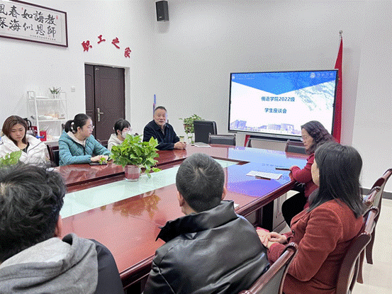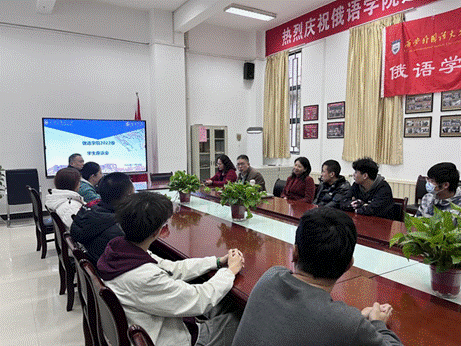 于2022年11月16日下午在H106举行2022级学生座谈会,院长黄达远、党委书记魏民安、副院长马晓迪、欧亚语言与区域国别系主任海纳尔·达列力别克、俄语专业带头人温玉霞教授、2022级兼职辅导员张佩琛、2022级部分同学参加本次交流会。