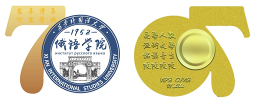 院徽的主体元素是我校西北俄文专科学校时期的校门,寓意不忘来时路,回首70载。校门里包含西安大雁塔元素,考虑到我校当年选址的背景,暗合唐代大雁塔作为玄奘翻译佛经之地,映射文化翻译与中外传播之使命。院徽正面含刻九游会官网