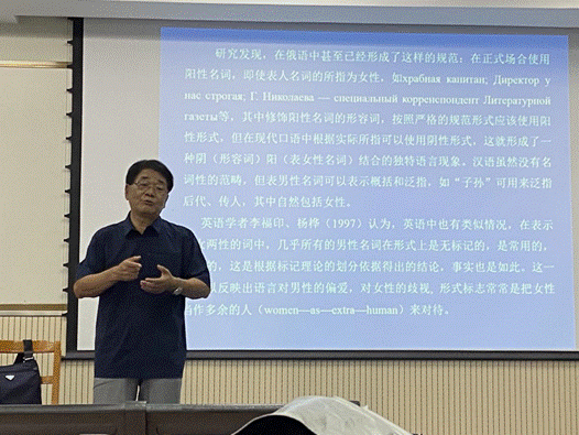 周教授从标记理论的基本内涵、俄汉语中的语用标记差异、社会性别语用标记的不对称现象以及关于取消女性标记的建议四个方面展开论述。他以语用标记的内涵为引,牵出语言使用的无标记和有标记两种成分的二元对立关系。同时,周教授以切实生动的应用实例引发学生对俄汉语中标记理论差异的思考,从而对标记理论的研究又切入跨文化交际的视角。借助于有关语用标记的丰富阐述,周教授分析了俄汉语中社会性别语用标记的不对称现象,他表示,男女两性的言语行为都带有明显的语用标记,体现了语言中反映出来的人们对男女两性适切行为的社会期望。然而俄汉称呼语中也存在着称谓视点的性别变换现象,即“异性而呼”表达心理上的接近和认同或戏谑意味,以此反应特定情感色彩或态度。整场讲座内容深入浅出,举例切实动人,引人入胜。