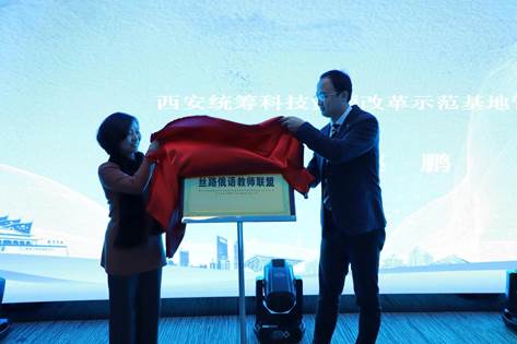 院长邓滢作为“联盟”会长单位代表,与科统办赵鹏副主任共同为联盟揭牌。赵副主任表示,俄语工作者在丝路合作交流中发挥着举足轻重的作用,希望各位俄语教师和学生在服务于“一带一路”倡议和“欧亚联盟”的大框架下,抢抓机遇、携手合作,为促进中俄友好交流与经贸发展贡献智慧!