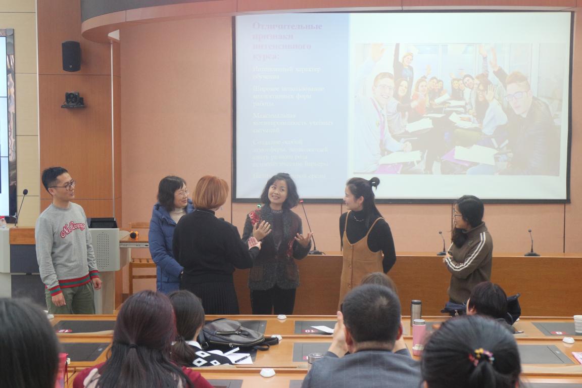 Рыжих Ю.М.老师以长期教学实践有助于形成高效的教学方法为主题,介绍了高效课堂的突出特点:高效的教学方法、小组形式的广泛参与、语言环境的建立、创设特殊情境消除学生心理障碍、有效的师生互动等。通过现场与老师们的互动游戏生动展示了课堂互动对于语言学习的重要性。她强调,参加实践活动对语言学习有很大帮助,积极性的培养离不开语言实践,因此在教学中应多鼓励学生参加实践活动,培养学生学习俄语的自主性。此外,还应鼓励学生在课堂上大胆回答问题,积极主动地参与课堂互动,在练习中不断进步。