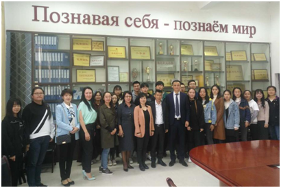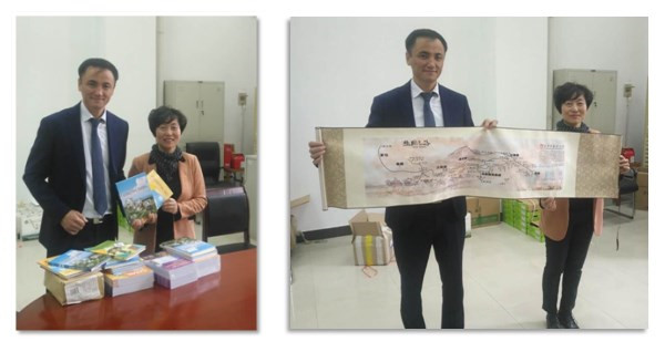 会见结束后,阿布德拉赫曼诺夫·凯拉提参赞向哈萨克语专业的学生赠予了哈萨克语文化资料书籍,邓滢院长代表学院接受赠书并向来宾赠礼致谢。