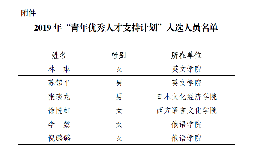近日,我校发布《关于公布2019年“青年优秀人才支持计划”入选人员名单的通知》,确定林琳等17人入选2019年西安外国语大学“青年优秀人才支持计划”。其中,九游会 教师李懿、倪璐璐入选名单。祝贺两位老师!【背...