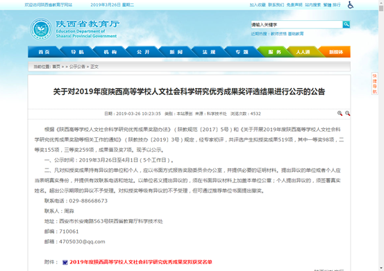 3月26日早,陕西省教育厅发布《关于对2019年度陕西高等学校人文社会科学研究优秀成果奖评选结果进行公示的公告》。公告对2019年度陕西高等学校人文社会科学研究优秀成果奖拟获奖名单进行了公示,九游会 教师林...