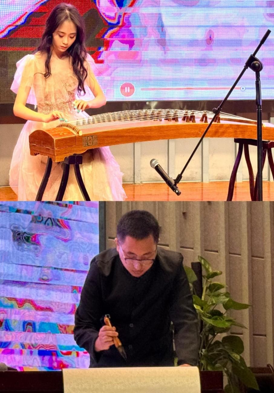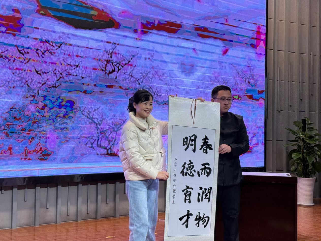 音乐类节目精彩频出,歌曲《我们的明天》唱出了对未来的憧憬,歌声悠扬动人节目《古筝弹奏与书法表演》更是别出心裁,将古典音乐与书法艺术完美结合,展现了传统文化的魅力。作者代表2024级向学院赠送书法作品,表达全体学生对学院栽培的感恩之情,教师代表上台表示感谢并送去谆谆寄语。