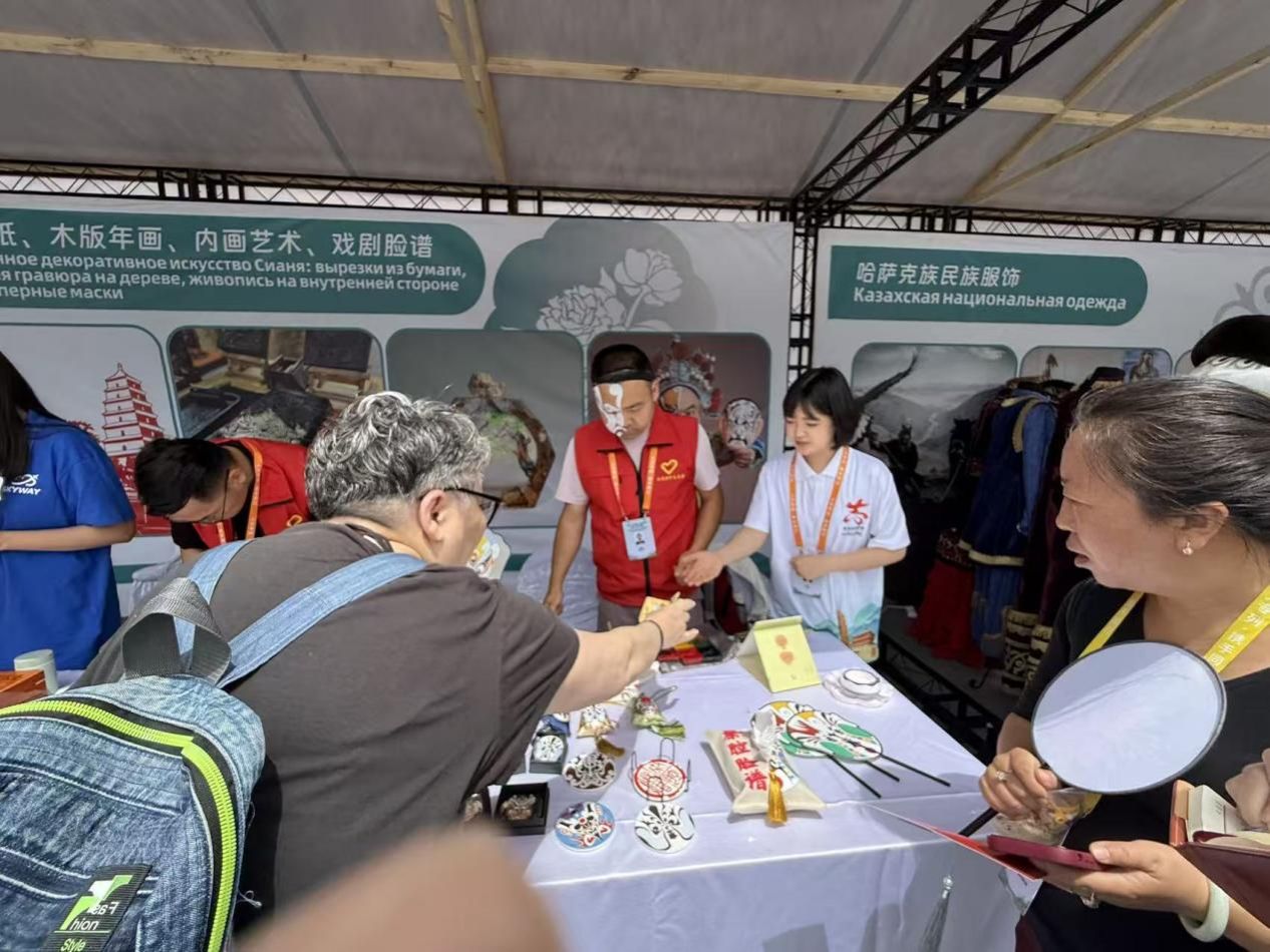 师生充分发挥专业优势,承担起随车翻译、活动协调等任务。在专列抵达阿拉木图后,志愿者团队立即投入到文化交流活动的筹备工作中,在特色集市交流活动中,志愿者向当地居民翻译讲解来自西安的珍贵非遗手工艺品,详细介绍茯茶文化的千年传承,并协助中医专家进行文化体验活动,帮助阿拉木图当地居民深入了解中国优秀传统文化。