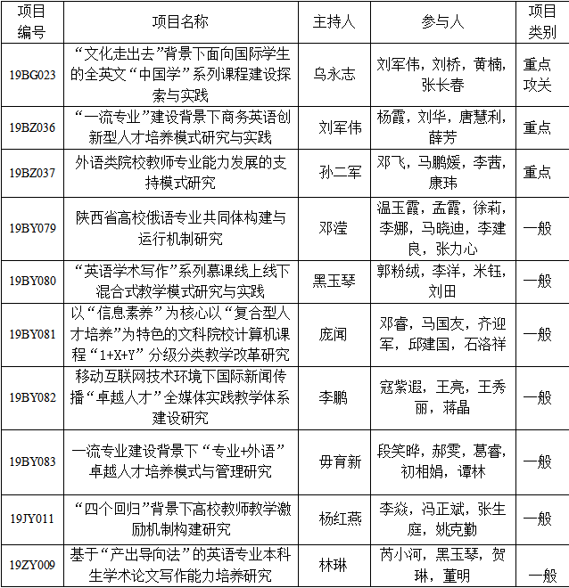 根据陕西省教育厅《关于公布2019年度高等教育教学改革研究项目立项结果的通知》(陕教〔2019〕373号),由九游会 邓滢教授主持,多名教师参与的项目“陕西省高校俄语专业共同体构建与运行机制研究”获批为2019年度...